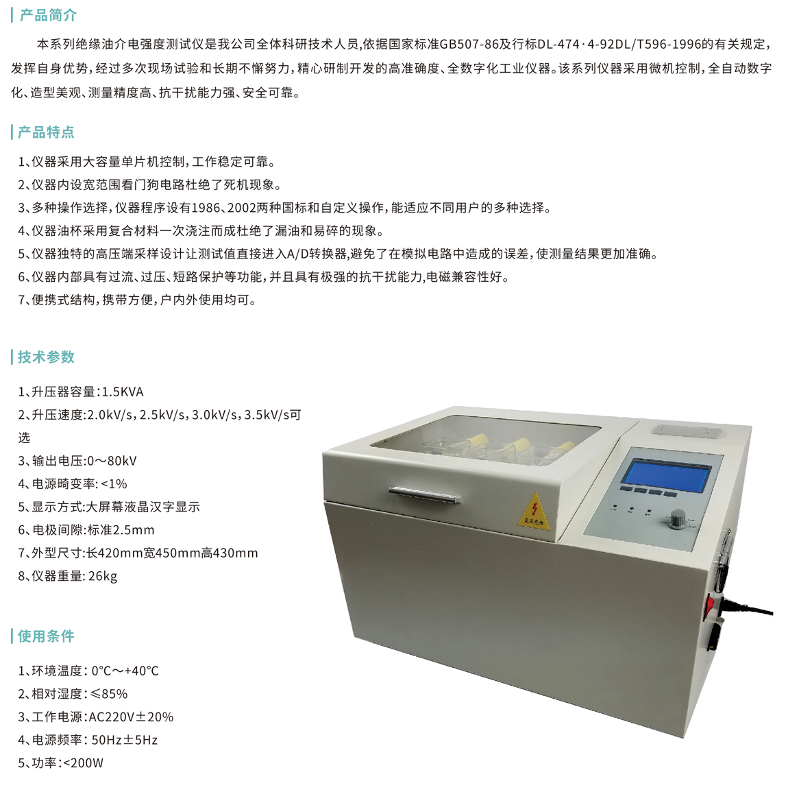本系列絕緣油介電強度測試儀是我公司全體科研技術人員,依據國家標準GB507-86及行標DL-474·4-92DL/T596-1996的有關規(guī)定, 發(fā)揮自身優(yōu)勢,經過多次現場試驗和長期不懈努力,精心研制開發(fā)的高準確度、全數字化工業(yè)儀器。該系列儀器采用微機控制,全自動數字 化、造型美觀、測量精度高、抗干擾能力強、安全可靠。