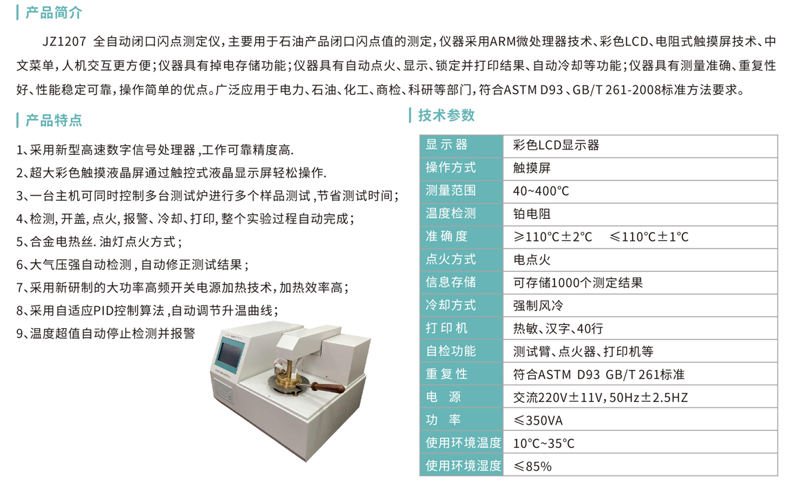 JZ1207全自動(dòng)閉口閃點(diǎn)測(cè)定儀,主要用于石油產(chǎn)品閉口閃點(diǎn)值的測(cè)定,儀器采用ARM微處理器技術(shù)、彩色LCD、電阻式觸摸屏技術(shù)、中
