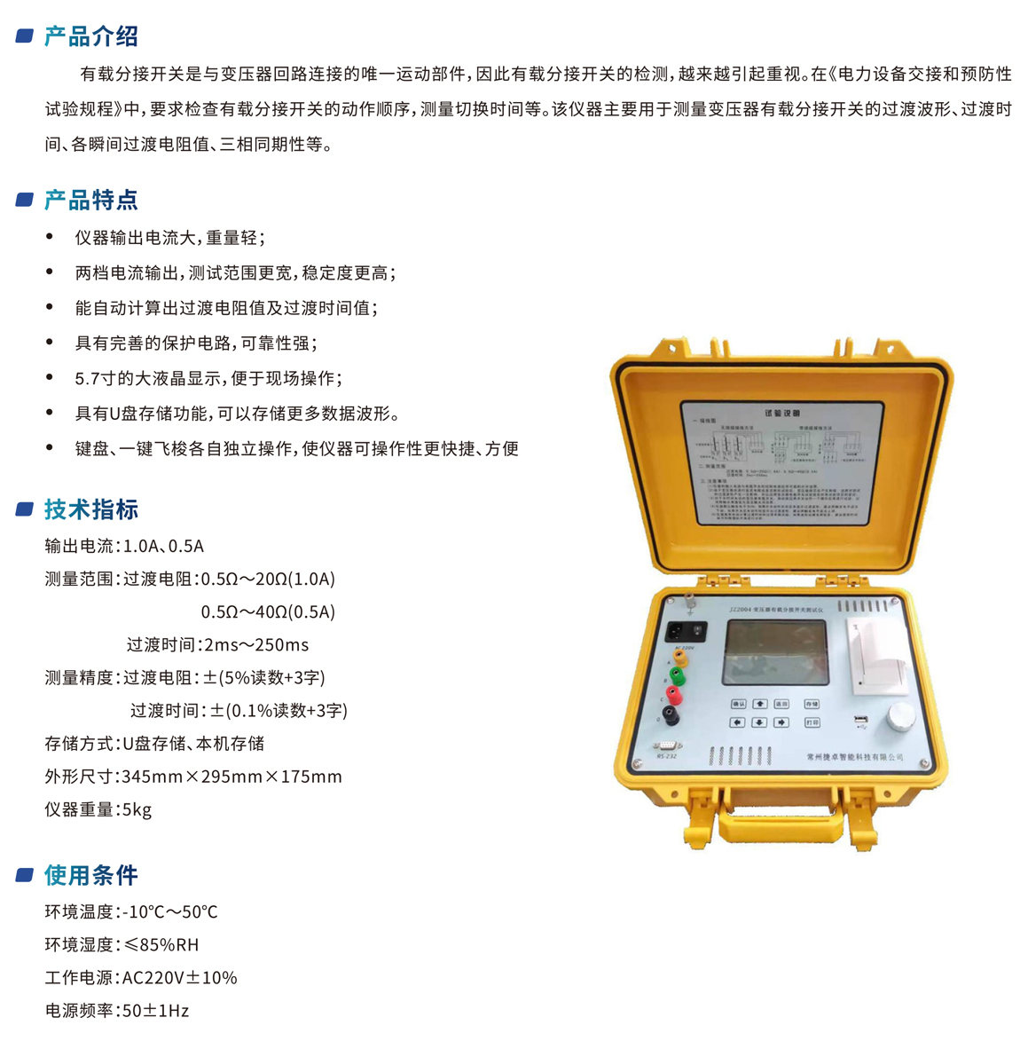 有載分接開關是與變壓器回路連接的唯一運動部件,因此有載分接開關的檢測,越來越引起重視。在《電力設備交接和預防性 試驗規程》中,要求檢查有載分接開關的動作順序,測量切換時間等。該儀器主要用于測量變壓器有載分接開關的過渡波形、過渡時 間、各瞬間過渡電阻值、三相同期性等。
