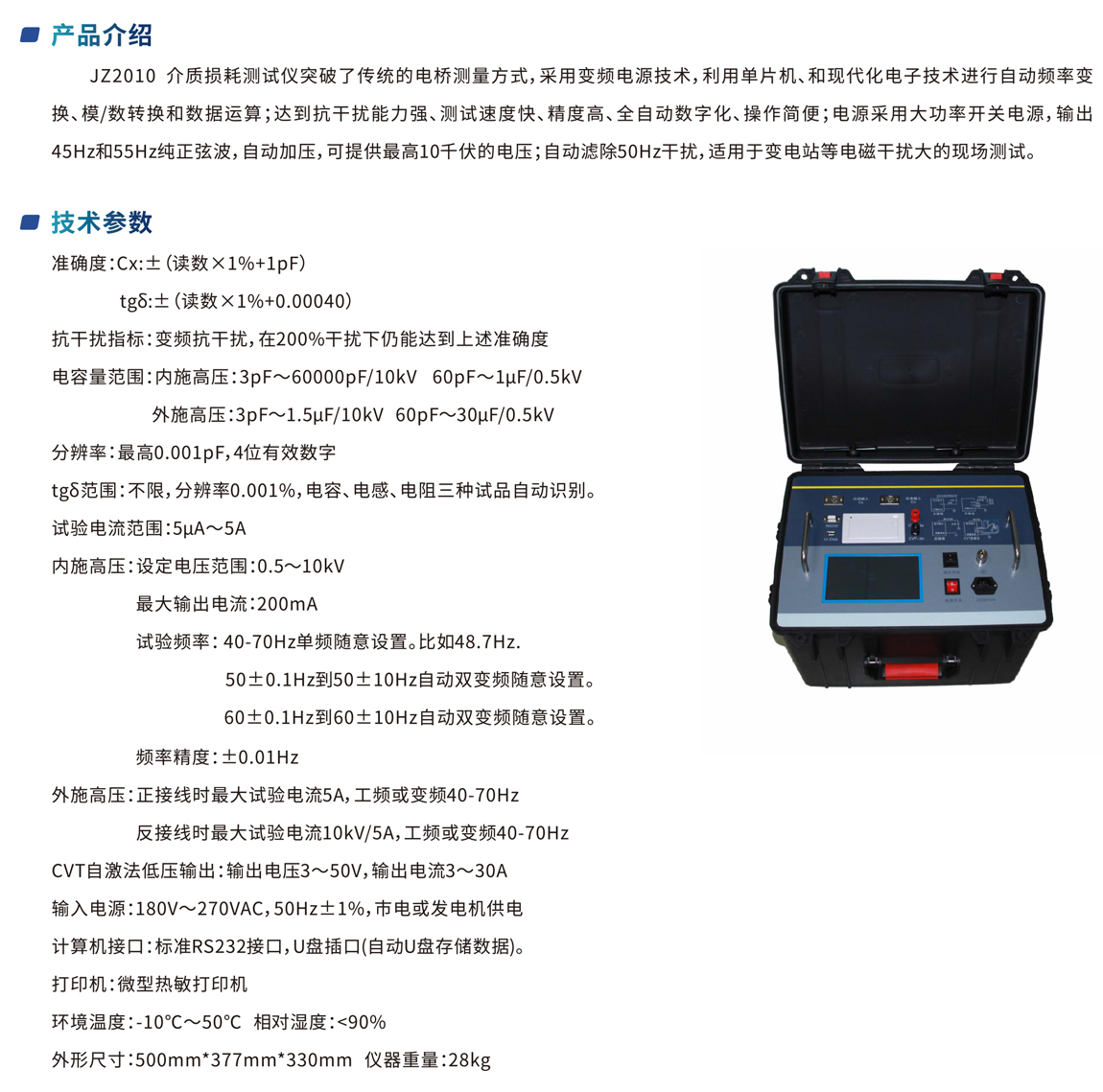 JZ2010介質損耗測試儀突破了傳統的電橋測量方式,采用變頻電源技術,利用單片機、和現代化電子技術進行自動頻率變 換、模/數轉換和數據運算;達到抗干擾能力強、測試速度快、精度高、全自動數字化、操作簡便;電源采用大功率開關電源,輸出 45Hz和55Hz純正弦波,自動加壓,可提供最高10千伏的電壓;自動濾除50Hz干擾,適用于變電站等電磁干擾大的現場測試。