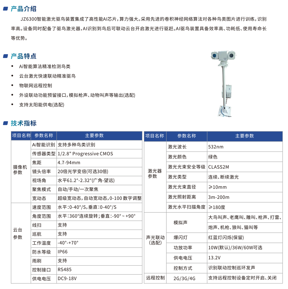 JZ6300智能激光驅鳥裝置集成了高性能A芯片,算力強大。朵用先進的卷積神經網絡算法對各種鳥類圖片進行訓練,識別 率高。設備同時配備了驅鳥激光器,A識別到鳥后可聯動云臺開啟激光進行驅趕。A驅鳥裝置具備效率高、功耗低、使用壽命長 等優勢。